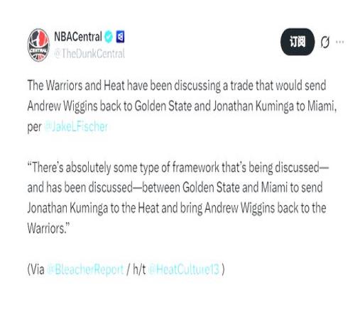 北京時(shí)間1月28日,NBA交易市場(chǎng)的流言焦點(diǎn)再度聚焦于金州勇士與邁阿密熱火身上。據(jù)名記Fischer最新報(bào)道,兩隊(duì)關(guān)于鋒線球員的交易談判已進(jìn)入實(shí)質(zhì)階段,一套以庫明加換維金斯為核心的3換1交易框架正在逐步成型。交易流言的發(fā)酵并非偶然。早在此前,名記Stein就曾披露勇士有意通過交易庫明加換回舊將安德魯·維金斯,如今這一設(shè)想已從探討走向?qū)嵅佟T缭?月16日庫明加主動(dòng)遞交的交易申請(qǐng),不過隨后巴特勒遭遇傷病,科爾不得不重新啟動(dòng)庫明加,盡管復(fù)出的兩場(chǎng)表現(xiàn)不俗,但是很快遭遇了傷病,而庫明加本人的離隊(duì)訴求始終未變,這無疑讓勇士管理層加快了交易談判的進(jìn)程。