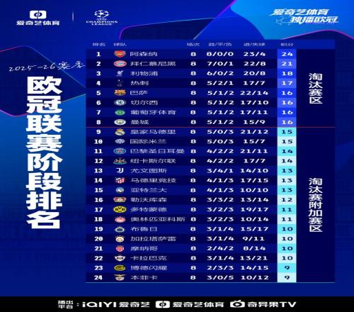阿森納8戰(zhàn)全勝以聯(lián)賽階段第一晉級16強,利物浦、熱刺、切爾西、曼城均進入前八,紐卡第12名將參加淘汰賽附加賽。