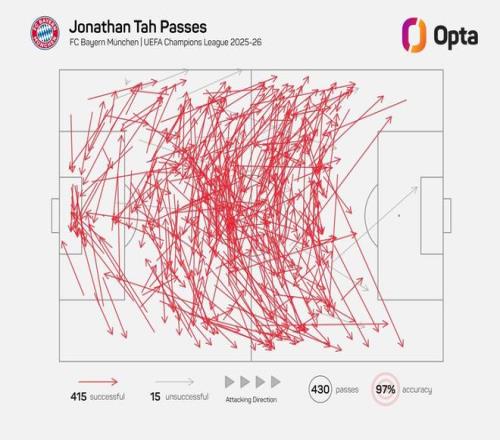 據(jù)Opta統(tǒng)計(jì),約納坦-塔本賽季歐冠至今嘗試了430次傳球,415次成功,15次失敗,傳球成功率高達(dá)97%,這位拜仁后衛(wèi)是本賽季歐冠至今傳球成功率最高的球員。